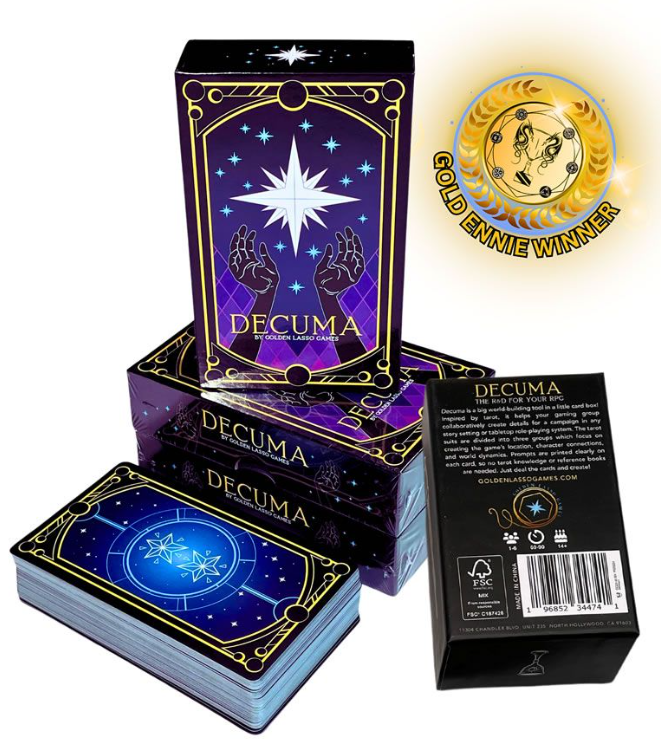 Decuma is a big world-building tool in a little card box! Inspired by tarot, it helps gaming groups collaboratively create details for a campaign in any setting or tabletop role-playing system. The tarot suits are divided into three groups which focus on creating location details, character connections, and world dynamics. 78 full color cards, an x-card, and an instruction booklet are all included in the eye-catching card box. Prompts are printed clearly on each card, so no tarot knowledge or reference books are needed. Just deal the cards and create! Decuma is a great tool for Dungeon masters or Game masters who like to add their own flavor to campaigns, non-traditional and story game lovers, and tarot enthusiasts too! Players: 1 - 6 Play time: 60-90 minutes