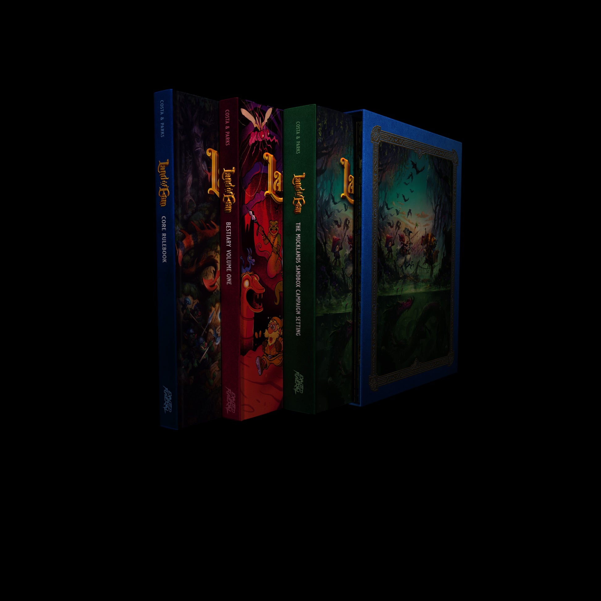 The Lord of the Rings meets The Muppets in this lighthearted, easy-to-learn, fantasy tabletop roleplaying game about being creative! The Land of Eem Standard Box Set contains three hardbound volumes: the Land of Eem Core Rulebook, the gigantic Mucklands Sandbox Campaign Setting, the Land of Eem Bestiary Vol 1., with the Mucklands hexcrawl laminated poster map!Set in the expansive fantasy world of the book series Rickety Stitch and the Gelatinous Goo and Dungeoneer Adventures, the Standard Box Set is a great way to explore the Land of Eem.